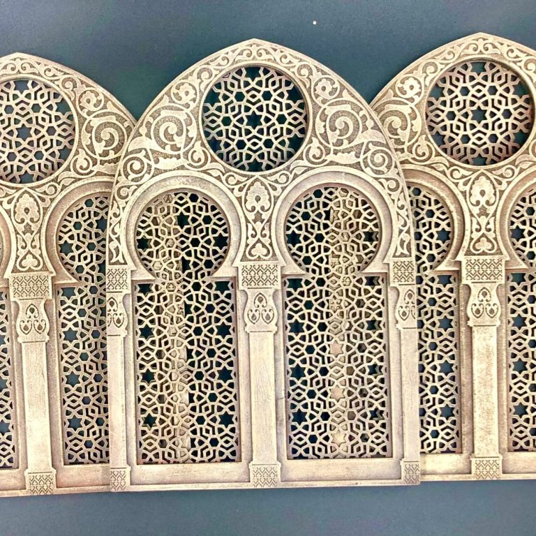 Inspirada en las ventanas del complejo religioso de Kala'oon o Kalaum ubicado en El Cairo. La reproducción de esta ventana ubicada en el mausoleo de este lugar turístico se ha planteado y producido combinando tres capas de MDF, a las que se les ha otorgado un acabado de yesería para destacar toda la delicadeza de los grabados que posee. El producto que ofrecemos es polivalente, sirve tanto para ser incorporada a la fachada de una edificación, como para ser un importante punto de atención en la escena de una habitación.